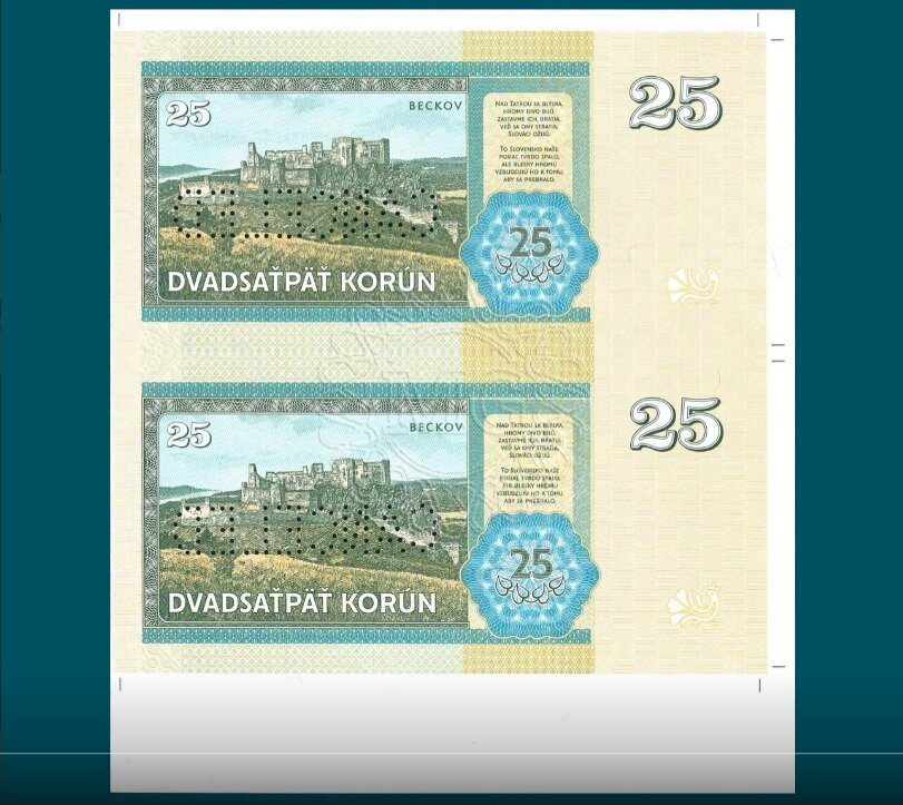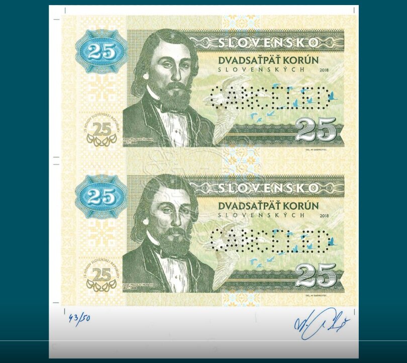 Aršík 25 Korún J.M.Hurban 2018 s podpisom Mateja Gábriša perforácia CANCELED