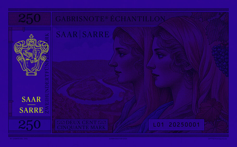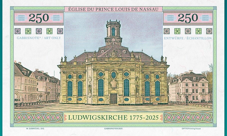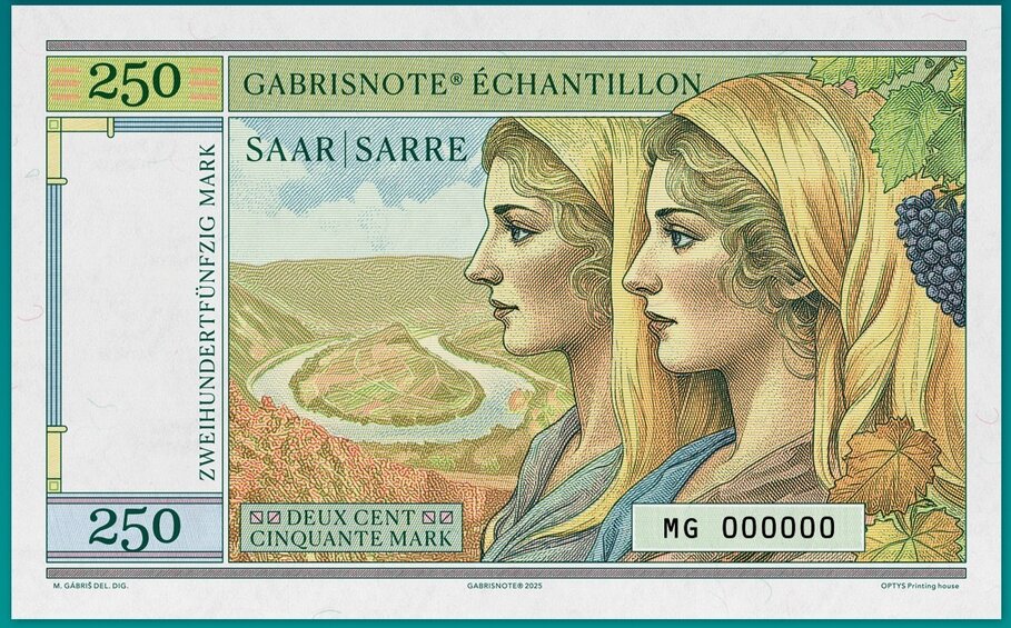 Dostal som možnosť pripraviť špeciálnu gábrišovku pri príležitosti 250. výročia kostola v Saarbrückene, ktorý som už raz použil na gábrišovke ako hlavný motív rubovej strany (100 francs / mark Saarland 2017). Pripravil som si dizajn a hneď ako sa objavil voľný termín v tlačiarni, dal som ju vytlačiť. Keďže získať priestor v špecializovanej tlačiarni nie je iba tak, tlač som zadal bez schválenia dizajnu. Objednávateľ - Dr. Thomas Bergholz ma však poprosil, aby som predsa len zmenil motív krajiny, pohľad na rieku Sáru (nemecky Saar). Tak vznikla druhá verzia tejto gábrišovky. Pôvodná číslovaná verzia A je určená pre OZ zberatelov Gábrišoviek a druhá číslovaná verzia B bola vytlačená na podporu kostola Ludwigskirche v Saarbrückene. Rozmery (mm): 140 x 87 mm Dátum vydania: október 2025 Číslovanie: varianta A séria AS - 700 ks varianta B séria SA - 800 ks varianta A séria MG 00000 - 200 ks varianta B séria MG 00000 - 200 ks
